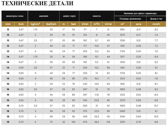 Таблица параметров и технических возможностей спринклерной пушки в зависимости от диаметра сопла и давления.